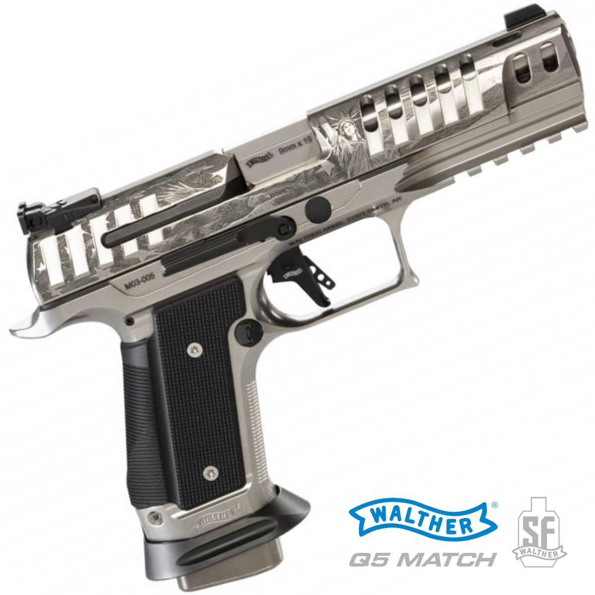 Walther Q5 Match SF Patriot je model určený primárně pro USA, o čemž svědčí rytina vytvořená italským rytcem Giovanellim s motivy lysohlavého orla, Sochy svobody a hvězd a pruhů. Povrch zbraně je ošetřen známou Teniferací, což je sycení povrchu oceli dusíkem a uhlíkem ve speciální solné lázni. Materiál tak získá obrovskou povrchovou trvdost a odolnost proti korozi. V tomto případě je povrch závěru a rytin nadále leštěn do vysokého lesku.